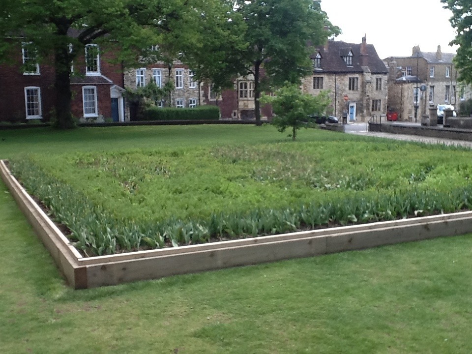 The Mosaic had been planted in a specially created bed on the East Lawn of Lincoln Cathedral. The planting had taken place the previous September and the final bulbs were laid by the Defence Attaches from 7 countries, the Dean of Lincoln Cathedral, the IBCC Trustees, children from Lincoln Minster School, Hans Onderwater, the world’s leading expert on Operation Manna and Op Manna veterans Dick Tinsley and Len Dorricot.