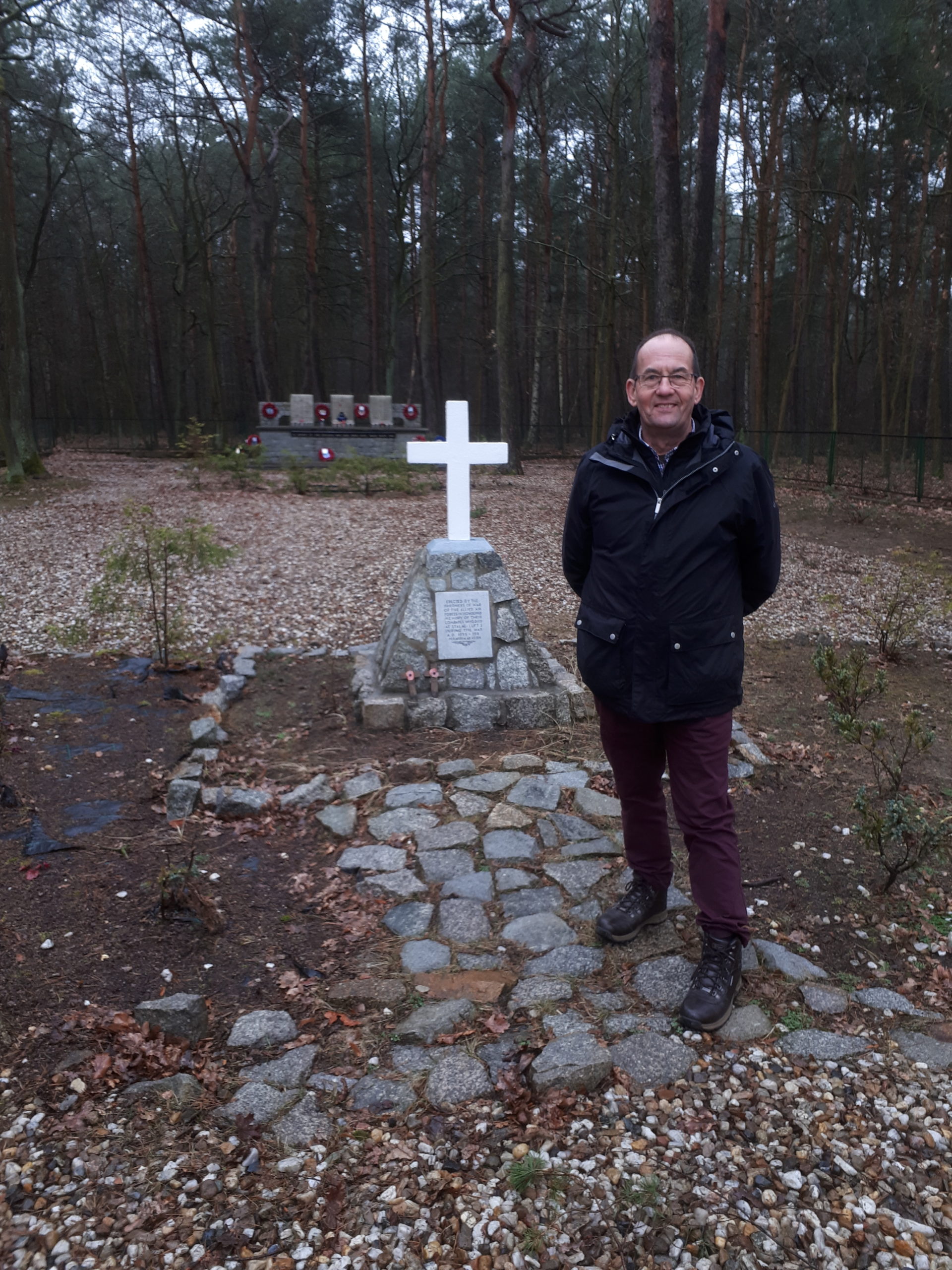 The group of RAF personnel and I flew out to Berlin on Thursday 13 February and before going by coach to Zagan. We visited the Military Cemetery in Berlin. There, I laid a wreath for the RAF’s ex-Prisoners of War Association on the central memorial. Small poppy crosses were laid by other members of our group on 20 individual graves. One of those was for Sgt Stan Chalklin buried with 5 other members of his crew. Coincidentally, Brian Chalklin (Stan’s great nephew) and his wife Lynne Chalklin visited the centre a couple of weeks before the trip, we found him on the walls and then I offered to visit Stan’s grave and sent them a photo.