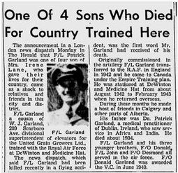 Flying Officer Donald Garland VC was one of 4 brothers who lost their lives serving the RAF during WW2. He was born to Patrick and Winifred in Ballinacor, County Wicklow, Ireland in 1918, the youngest of 5 children. His siblings were Patrick (1908 -1945), John (1910 -1943), Sheila (1912 -1988) and Desmond (1916 – 1942).