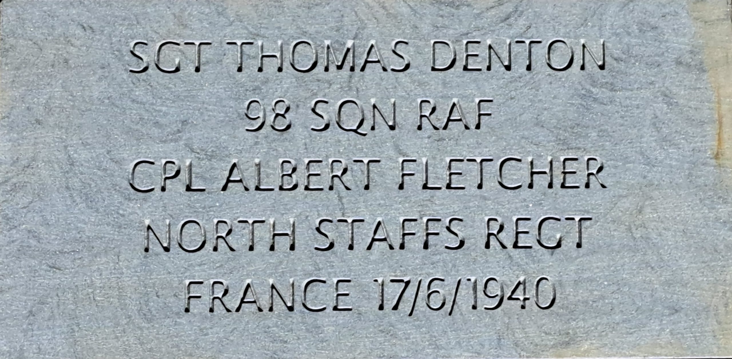 A few years after my wife and I were married I decided to research our family histories and to our surprise we found that both of our grandfathers had died on the same day, 17th June 1940 in northwest France. Both men were part of the allied forces trying to escape France as it was overrun by German forces, some of the 50,000 that didn’t make it off the beaches at Dunkirk. My grandfather Thomas Fredrick Denton was a sergeant in 98 squadron RAF and made it as far as the Lancastria which was anchored in the bay at St Nazairre. The Lancastria was bombed by German planes and sunk with a loss of life running into the thousands. Karen’s grandfather Albert Fletcher was a corporal in the North Staffordshire Regiment of the Army, and whilst some reports suggested he may have also made it to the Lancastria, it is believed he died in the Luftwaffe bombing of the railway station at Rennes, the bomb struck a munitions train creating a massive explosion resulting in the loss of over 800 lives.