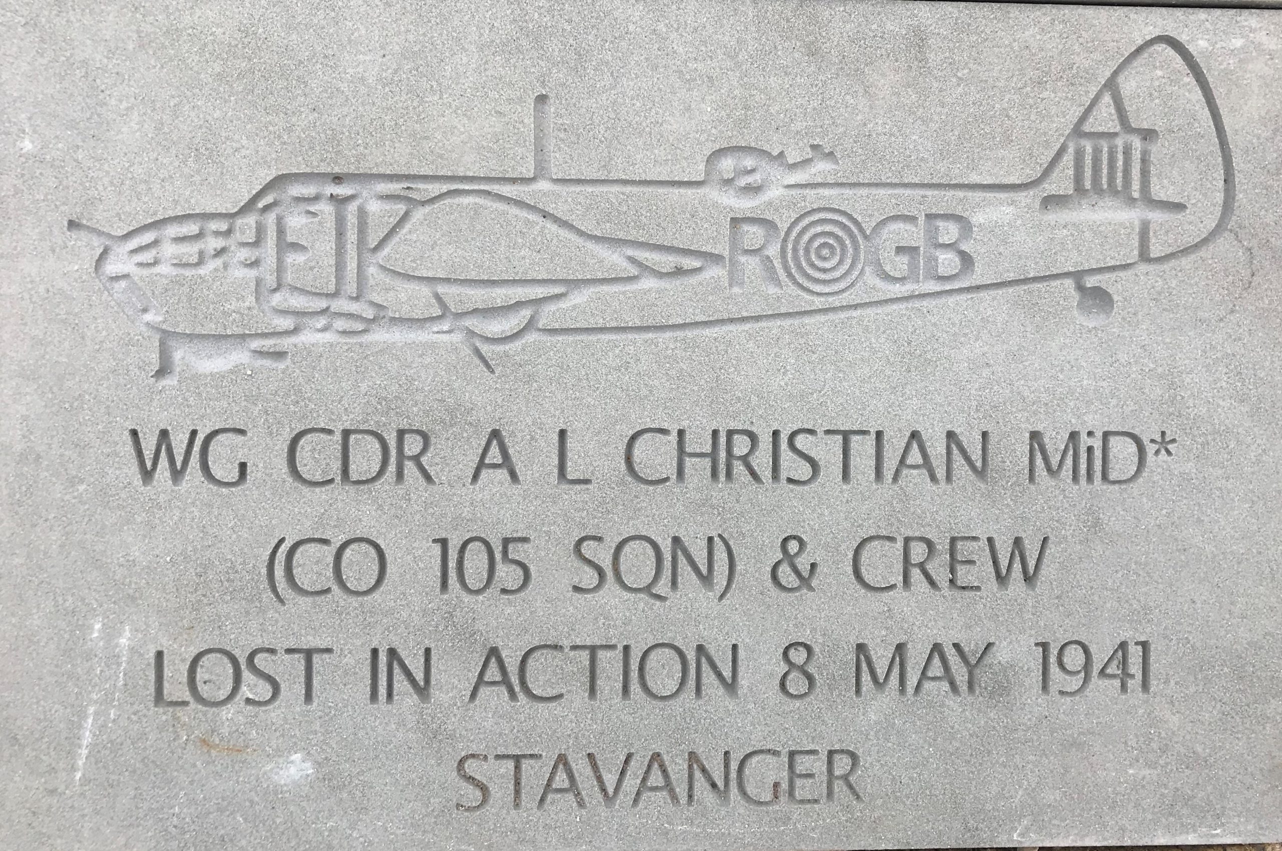 Depicted on the Stone is the badge of the Royal Australian Air Force and the Australian War Memorial which is in Campbell, a suburb in the  capital Canberra. This Memorial was unveiled on the 11th November 1941 and holds the Rolls of Honour which commemorates over 102,000 members of the Australian Armed Forces who have died during War Service, and since 1945, those killed in Wars and certain Peacetime Operations. The Tomb of the Australian Unknown Soldier is located here, along with an extensive National Military Museum.