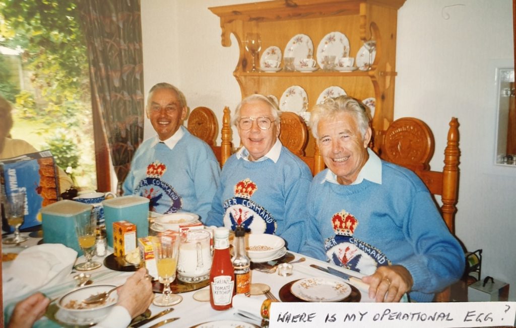 ‘Brogan’s Crew’ at one of many reunions – this one around the early 1990s. Dad, Joe Brogan and Charlie Kaye all wearing Bomber Command jumpers knitted by Mum