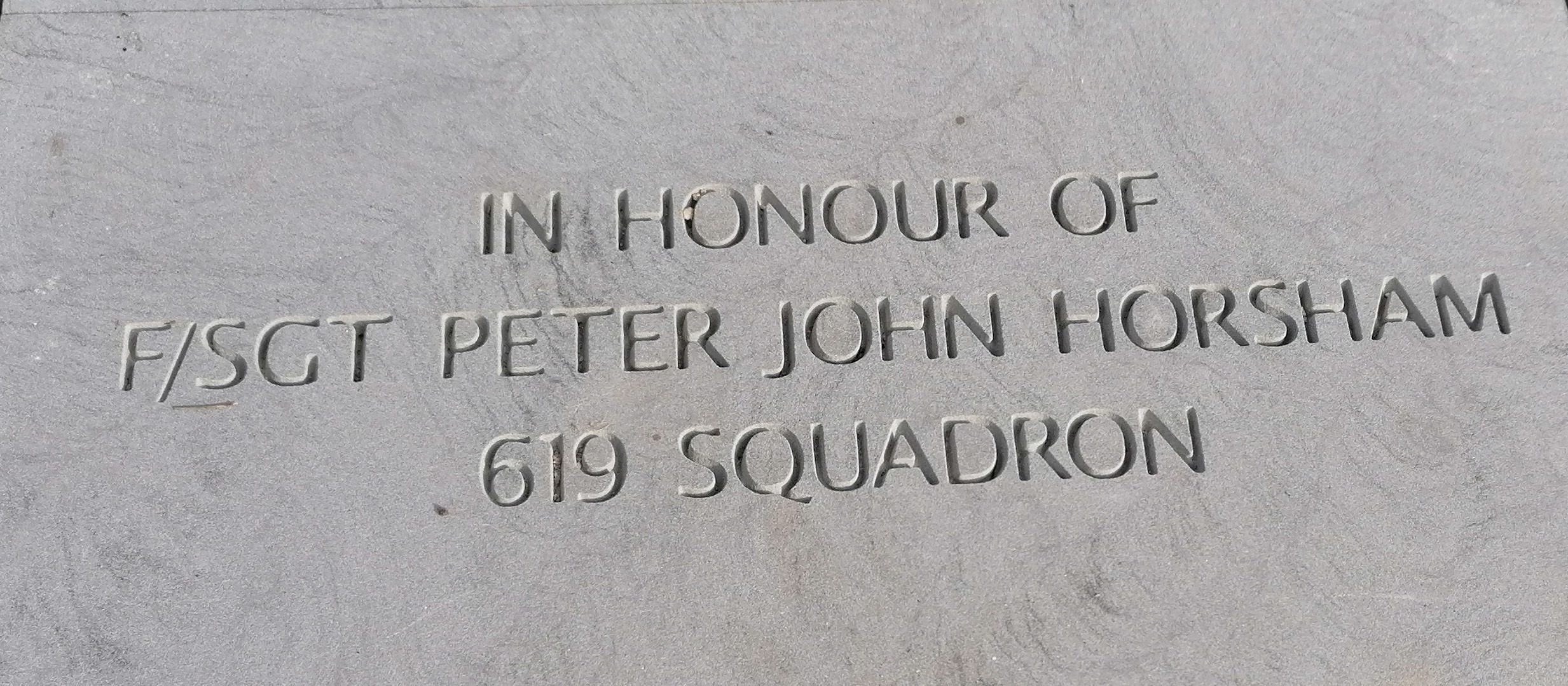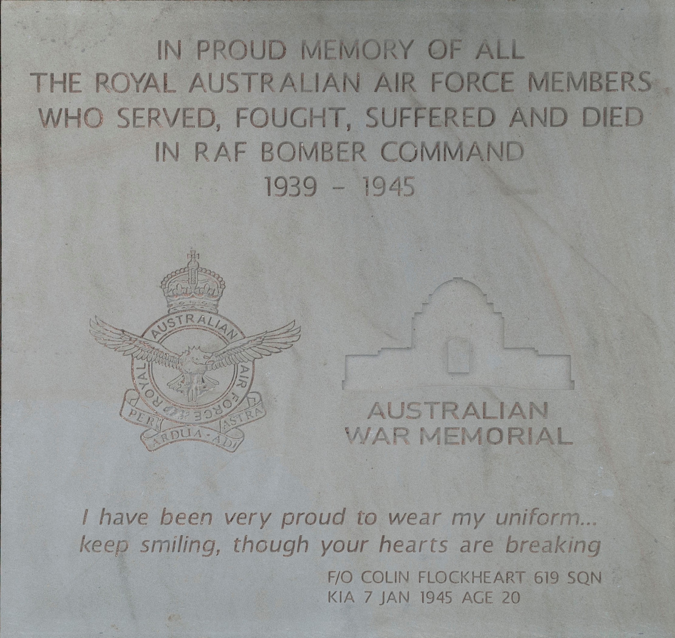 Towards the bottom of the Stone, we have an inscription from a letter written by Fg Off Colin Kelvin Flockhart who served on No 619 Sqn. Colin was born on the 1st February 1924 in Ashfield NSW. He attended school in Sydney, completed his accountancy studies before gaining employment with the Commonwealth Bank. When old enough he joined the RAAF and qualified as a pilot in 1942. After completing his flying course, he was sent to Canada for further training before arriving in England.  He converted onto the Lancaster and was posted to No 619 Sqn based at RAF Strubby here in Lincolnshire. On the 1st December 1944 Colin wrote a three page letter to his parents to be delivered in the event of his death. He described how he was happy in the RAAF, his belief in what he was doing, his faith in God and his appreciation of his family.