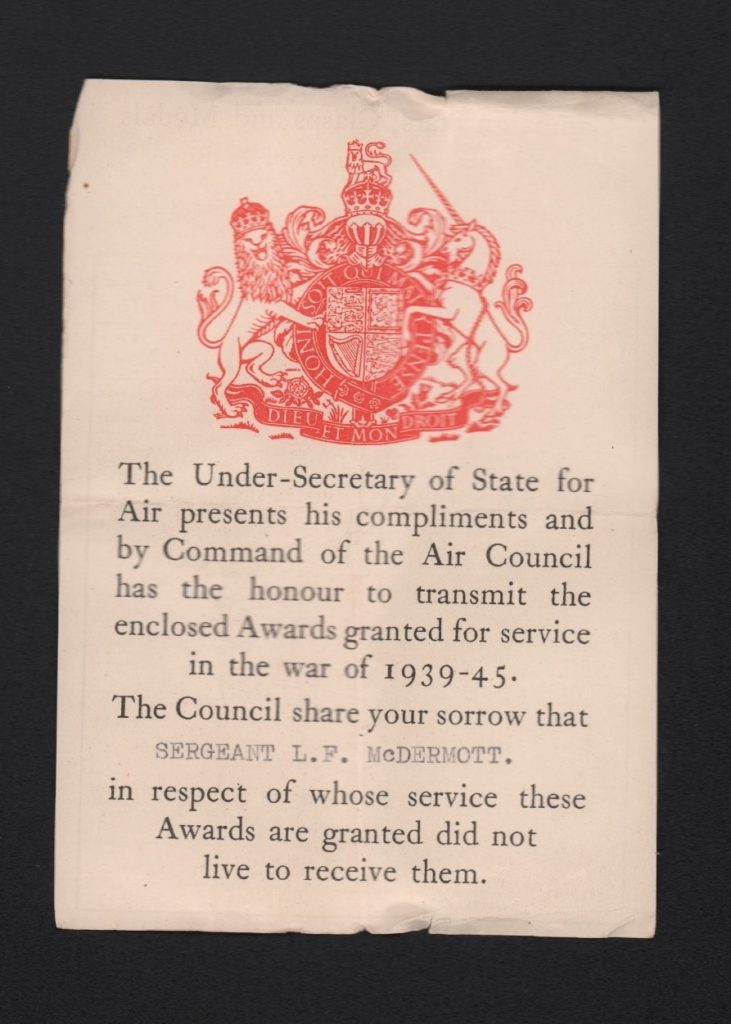 In late October 2019, the Thorpe family brought to the IBCC two medals in their original postal box and gifted them to the project. The 39-45 Star, and Aircrew Europe had been awarded to Sergeant LF McDermott posthumously.